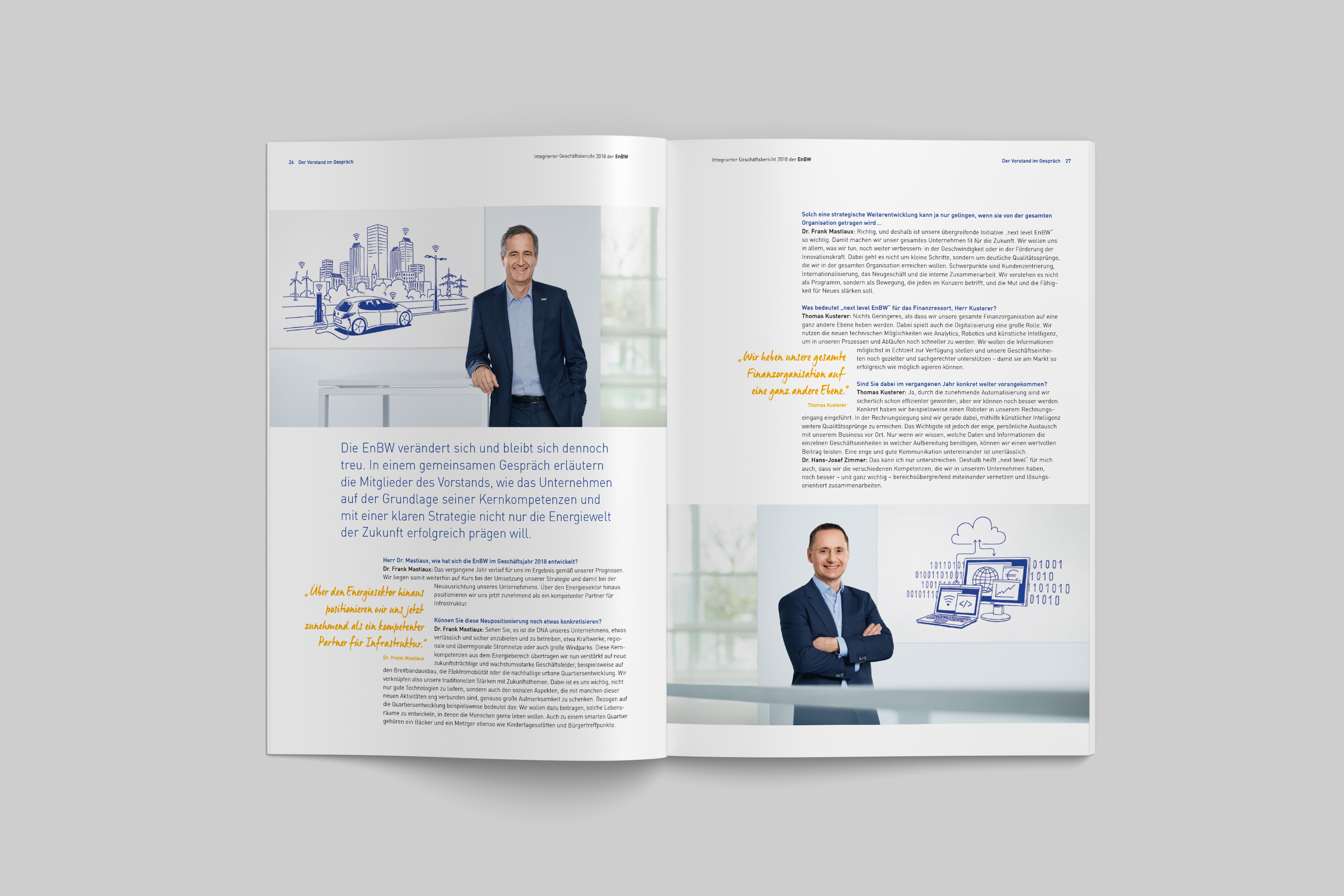 • Konzeption und Umsetzung der Imagestrecke und Titelgestaltung in Zusammenarbeit mit der Agentur IR-One, Hamburg sowie Weiterentwicklung der integrierten Berichterstattung bei der EnBW
